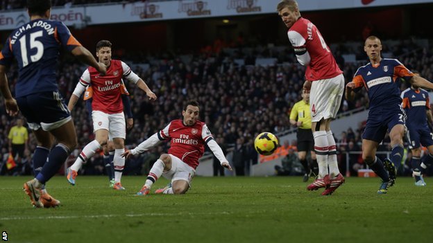 Santi Cazorla scored twice as Arsenal beat Fulham to secure a fifth successive top-flight win to remain at the top of the Premier League.
