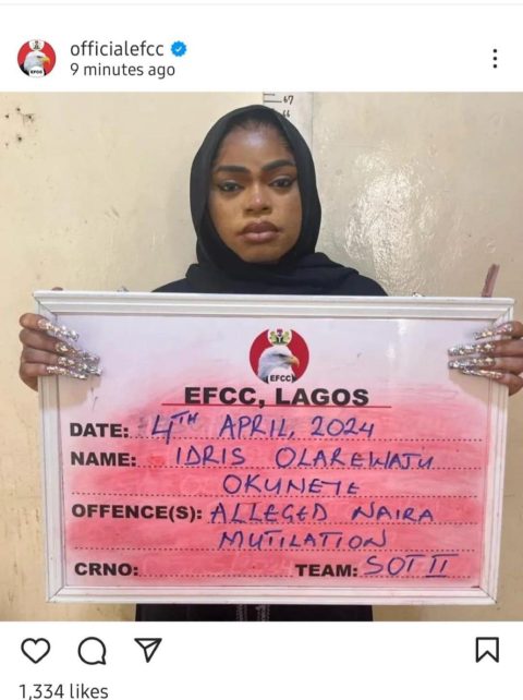 (AFRICAN EXAMINER) – The Economic and Financial Crimes Commission (EFCC) has arrested cross-dresser, Idris Okuneye famously known as Bobrisky over currency mutilation and abuse of naira notes.