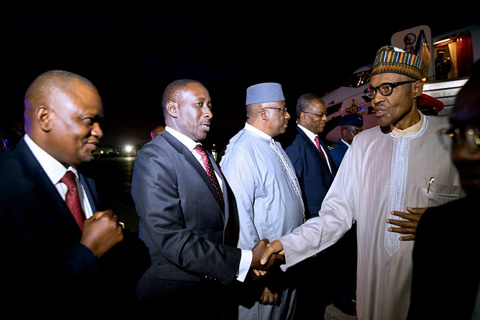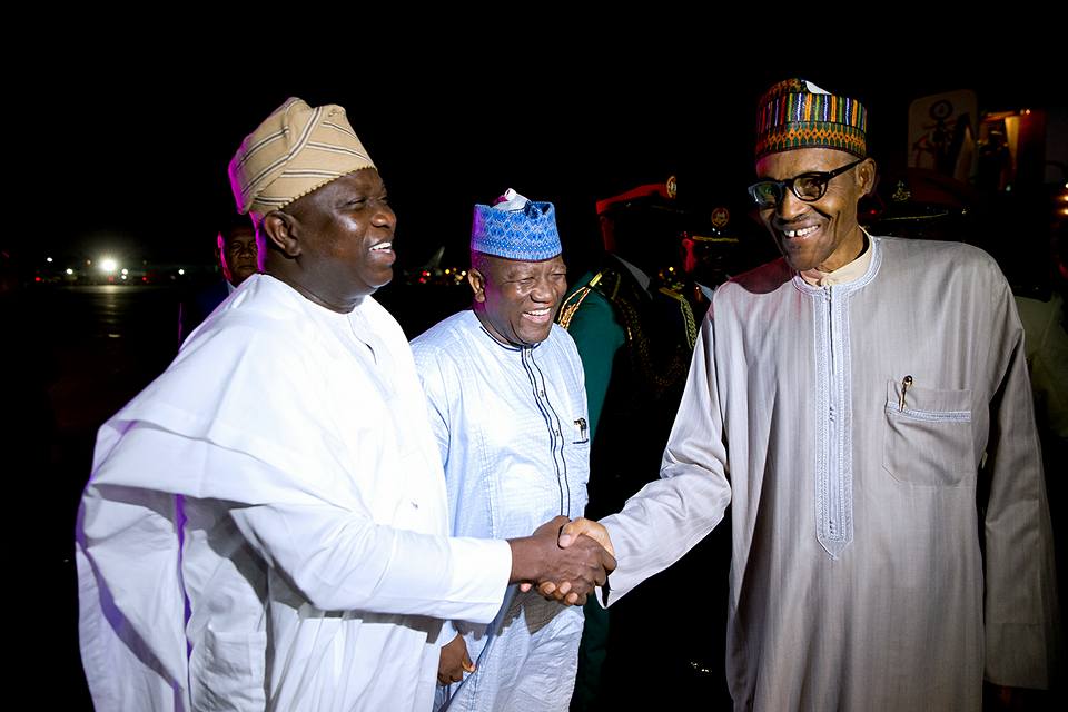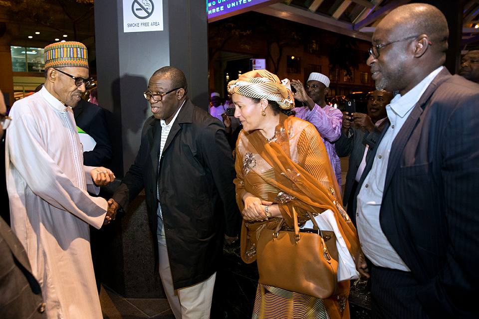 PHOTO: President Muhammadu Buhari, with the Lagos and Zamfara State Governors: Mr. Akinwunmi Ambode and Abubakar Yari respectively and other top Government officials as he arrived New York ahead of his participation at the 71st Session of the UN General Assembly (UNGA 71).